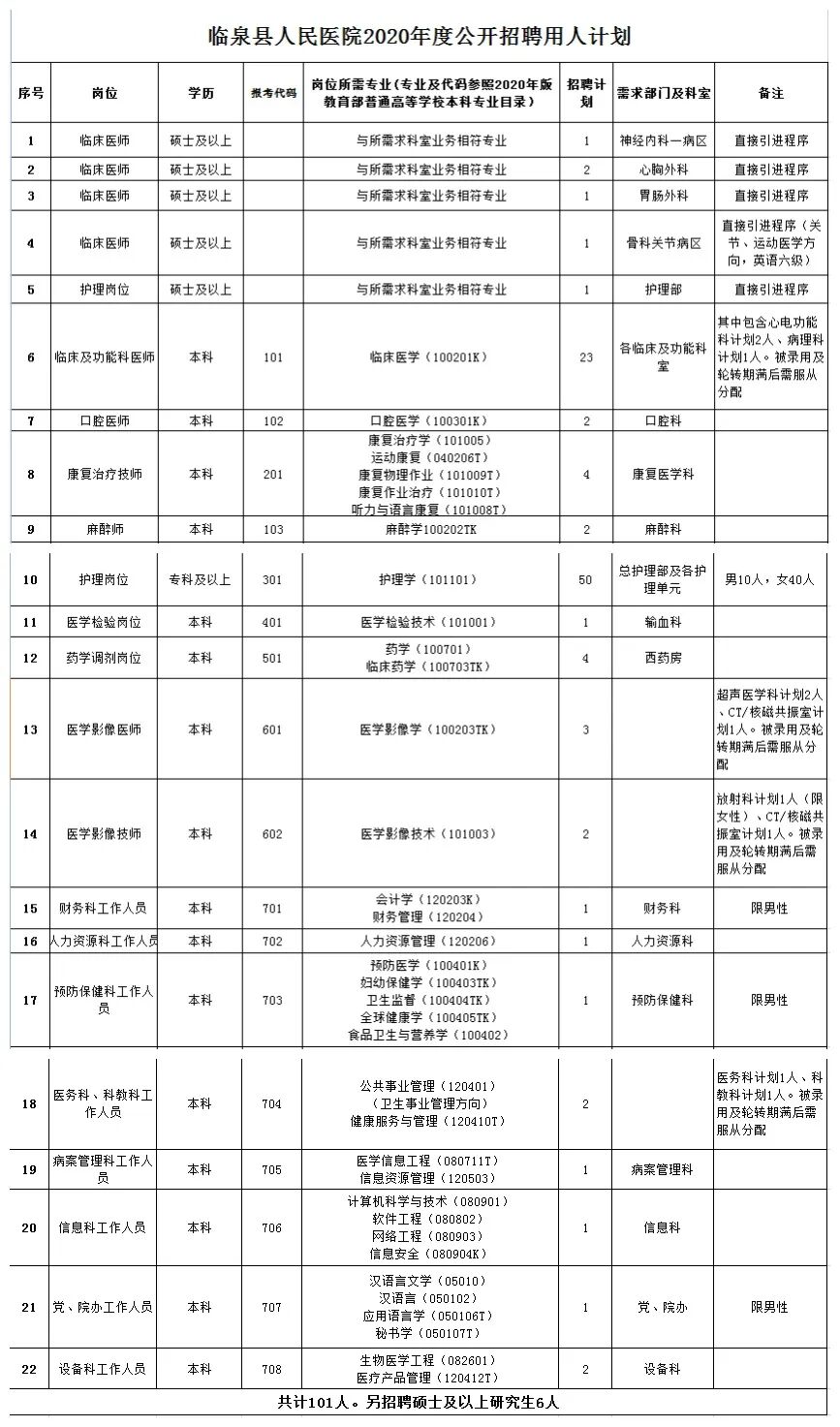 2020年公开招考专业技术人员公告 根据业务发展需要和公立医院改革有关精神,经请示上级同意,临泉县人民医院2020年度公开招考专业技术人员。现本着“公平、竞争、择优”的原则,将临泉县人民医院2020年度招考事宜公告如下: 一、招考计划 本次计划招考聘用本、专科学历专业技术人员101名(相关资料详见附件);另外计划引进研究生学历6名(研究生学历经相关审查程序后直接引进,不进入考试程序) 1.遵守宪法和法律; 2.具有良好的品行; 3.身体健康,五官端正(参照《公务员录用体检通用标准》); 4.岗位所需的专业或技能条件; 5.适应岗位所需的其他条件。 (二)具体条件 1.学历 本、专科毕业生均要求高中起点毕业以普通高中毕业证为准(不包含中职类毕业证),第一起点学历须为国家统招全日制普通高校毕业。专科学历不含成人学历、3+2学历及院校自主招生大专学历;本科学历不含成人学历、自考学历及各类专升本学历。 除护理专业外本科及以上毕业生还须提供学士学位证。 2.毕业年限 ①2020年应届本、专科毕业生; ②医学专业技术类(不包括护理,助产)2014年以来的本科毕业生; ③护理类(包括护理、助产)2015年以来的本、专科毕业生; ④其他岗位专业技术人员2015年以来的本科毕业生。 3.执业或从业资格 ①除2020年应届和2019年毕业的临床、医技医学专业的报考人员(护理专业除外),拟聘的其他时间历届毕业生来院现场资格初审时须提供相应岗位正式的执业资格或执业考试成绩合格证明,否则不予录用。其他职能岗位有相关专业从业资格证优先录用。 ②除2020年应届以外的其余护理专业毕业生须持有护士执业资格证(或护士执业资格考试成绩合格证明单)。 4.有下列情形之一的人员,不得报考: ①不符合招聘岗位条件要求的人员; ②现役军人; ③在读的非应届毕业生; ④经认定具有考试违纪行为且在停考期内的人员; ⑤曾因犯罪受过刑事处罚的人员和曾被开除公职的人员; ⑥涉嫌违法违纪、正在接受审查尚未作出结论的人员; ⑦其他不符合事业单位报考人员不得报考。 ⑧临泉县各医疗卫生单位在编人员不得报考。 5、因县卫健委组织的乡镇卫生院护理岗位招聘考试与临泉县人民医院护理岗位招聘考试同步进行,所有护理专业考生不得同时报考临泉县人民医院护理岗位和乡镇卫生院护理岗位。 三、招考流程 整个招考流程应聘人员按照常态化疫情防控要求佩戴口罩做好个人防护。 (一)报名。报名采用网络报名的方式进行。登录本院官网(www.lqrmyy.com)按提示报名,网上报名时间从2020年7月20日 08:00 点起至2020年7月26日18:00点止,逾期不予补报。 报考人员登录本院网站,填写《临泉县人民医院2020年度考试招聘人员报名表》,上传本人电子照片。报考人员填写的信息必须与本人实际情况、报考条件和所报考的岗位要求相一致。每位报考人员限报一个岗位,要求使用本人同一有效居民身份证进行报名和参加考试。凡弄虚作假者,一经查实,取消考试、聘用等资格。 (二)现场资格初审。网上报名结束后,报考人员于2020年7月27日08:00点至2020年7月31日18:30点期间,携带相关证件及材料到临泉县人民医院北区行政综合楼六楼会议室进行资格初审。逾期视为自动放弃,不再受理。 应届人员须携带本人有效居民身份证外,还须提供高中毕业证、学生证、就业推荐表(须加盖学校公章)原件及复印件和学信网学历(籍)信息(有二维码版)等能证明学历学制信息的相关资料。 历届人员须携带本人有效居民身份证、毕业证、执业(或专业)资格证的原件及复印件。本科及以上学历还须提供学位证(除护理专业外)。 说明:我院对所有报名人员信息的资格审查工作贯穿招聘工作全过程。报名人员填写的信息必须与本人实际情况和所报考的岗位要求相一致。凡弄虚作假者,一经查实,取消面试、聘用等资格。 (三)现场缴费。每人交考试费50元。通过现场资格初审的报考人员持人力资源科开具的缴费单到六楼会议室现场缴纳考试费用,缴费完毕后将缴费凭证其中一联递交人力资源科后,方视为缴费成功。缴费时间从2020 年7月27日08:00点至2020年7月31日18:30点,期内不缴费的,视为自动放弃。 (四)打印准考证。完成缴费的报考人员按通知时间开始从报名网站(临泉县人民医院官网)下载打印准考证,按准考证上指定的时间、地点,携带准考证和本人有效身份证参加笔试。 (五)笔试。为本专业和相关专业知识,满分100分。笔试时间另行通知。 (六)对部分紧缺专业技术岗位当报考人数出现缺额情况时,设定最低控制分数线60分。凡报考该岗位及专业的考生笔试成绩未达到最低控制分数线者不得进入面试环节。 (七)面试。考生的笔试成绩在临泉县人民医院网站公示。公示时间结束我院按照总成绩从高分到低分顺序确定入围参加面试人选。 入围面试比例。招聘岗位10个以上按1比1.2;招聘岗位6-9人按招聘岗位加2;5人(含5人)以下按招聘岗位加1;特殊紧缺岗位按1比1; 面试成绩满分10分(最高评分9.50分,最低评分6.00分),入围面试人员以及面试时间、地点在本院官网即时通知。根据安徽省物价局、安徽省财政厅皖价费[2009]118号文件规定,按每人80元标准收取面试费用。 (八) 成绩公示。报考人员的笔试和面试相加即为总成绩,并在本院网站公布。总成绩相同者,按笔试成绩排序。 (九)资格复审。公示无异议后,根据总