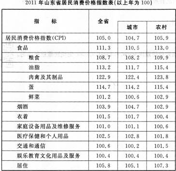 104、 2011年山东省居民消费价格指数表中,烟酒、衣着、交通和通信、居住四项指标中,农村高于城市的有( )项。