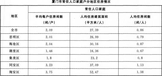 第六次人口普查显示,厦门市常住人口353.13万人。厦门市家庭户平均每户住房间数2.09间,家庭户人均住房建筑面积27.39平方米,人均住房间数0.86间。从住房来源来看,租赁住房占56.54%,自建住房占19.51%,购买住房占20.71%,其他占3.24%。从住宅建筑的承重类型来看,住房结构较为坚固,钢及钢筋混凝土结构占49.45%,混合结构占43.90%,砖木结构占3.87%,其他结构占2.78%。