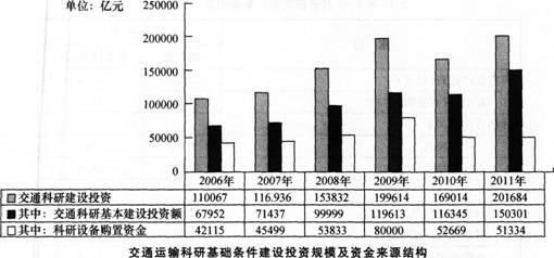 2011年,纳入统计的交通运输科技机构共完成科研基础条件建设投资20.2亿元,比上年增长19.3%。其中,基本建设资金达15.0亿元,占投资总规模的74.5%,所占比重较上年提高5.7个百分点;科研经费中科研设备投资完成5.1亿元,与上年相比基本持平,占投资总规模的25.5%。