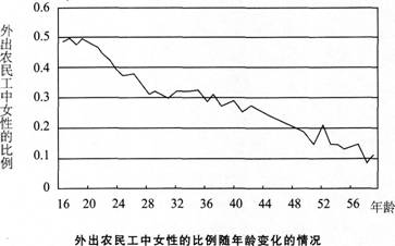 女性的比例也与外出农民工的年龄高度相关。