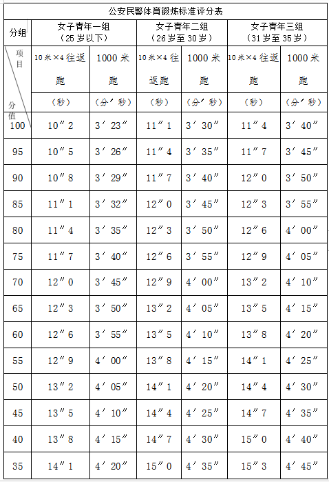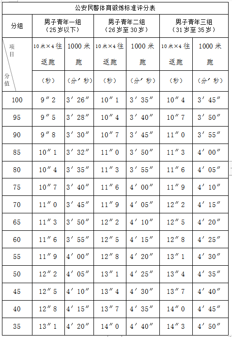 纵跳摸高不计成绩,纵跳摸高达到合格标准即视为合格,达不到合格标准者取消进入下一个环节资格。1000米跑或800米跑、10米×4往返跑每项100分。1000米跑、10米×4往返跑两项成绩之和除以2(体测成绩保留小数点后两位)即为体能测评得分。具体评分标准见下表: